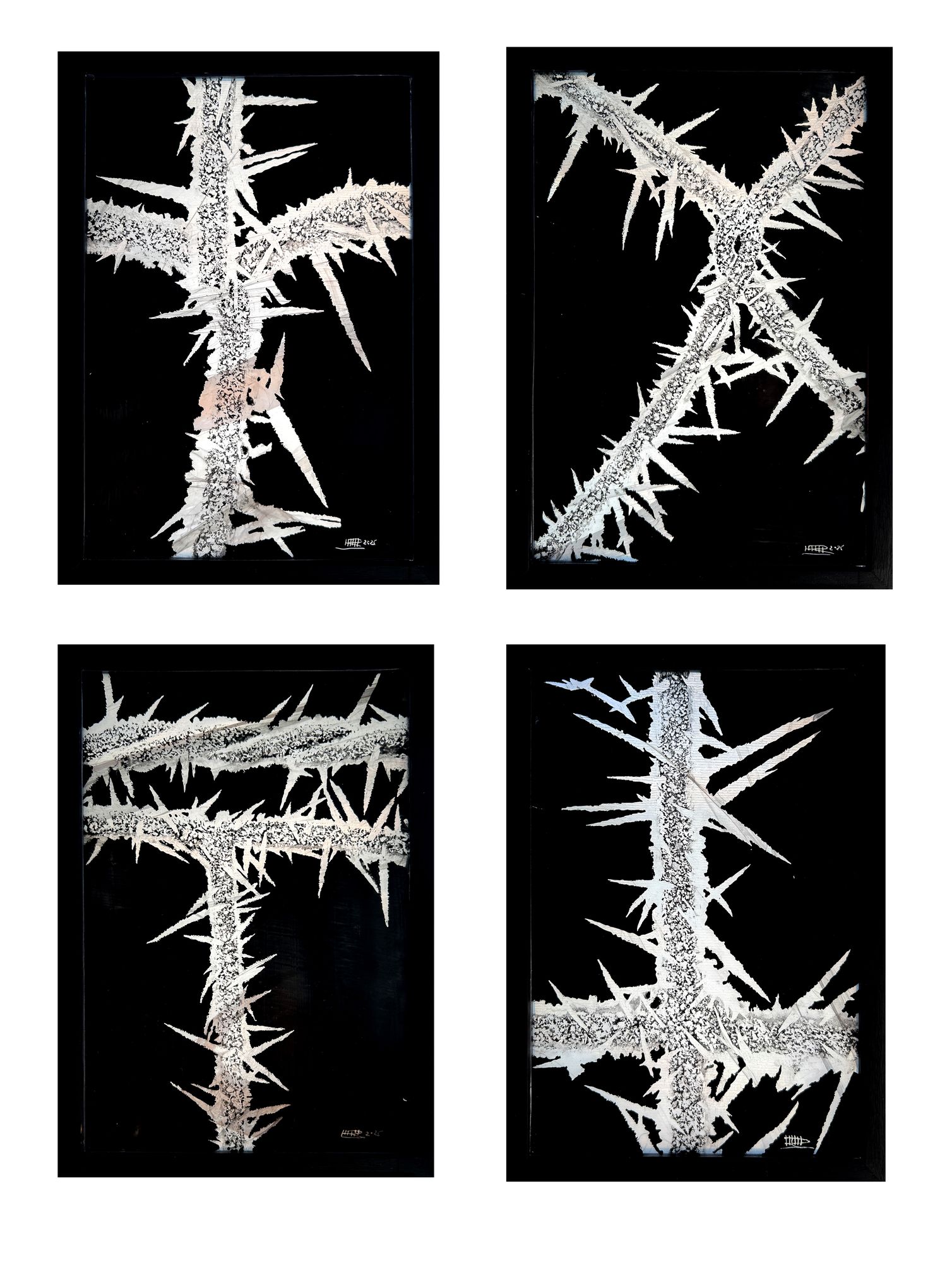 „Jégtövisek”, üvegablak, 2025, anyaga: festett üveg, mérete: 25×17 cm, 4db